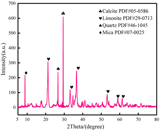 where d is the crystal plane spacing; n is the number of reflection levels; θ is the grazing angle; λ is the wavelength of the X-rays. The X-ray diffraction image of a crystal is essentially a fine and complex transformation of the microstructure of the crystal, and there is a correspondence between the structure of each crystal and its X-ray diffraction pattern. The results are presented in Table 1 and Figure 1. They showthat the COBL ore mainly contained Fe, Si, Al, Cu, and Ca in the form of limonite (Fe2O3-nH2O), kaolinite (Al4[Si4O10] (OH)8), quartz (SiO2), and calcite (CaCO3) crystalline phases. The peak height cannot represent the content of the phase, and the crystallization degree of quartz and calcite is high, and the corresponding peaks are also high.