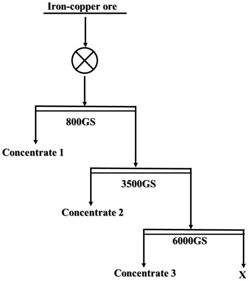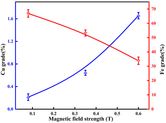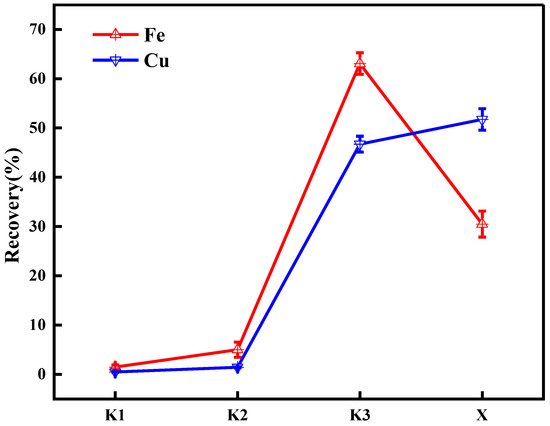 In order to enrich copper in COBL ore, it is necessary to pre-magnetic separation. Magnetic field strength is an important influencing factor in magnetic selection. In this section, different magnetic field strengths were investigated. The mineral particle size is −0.074 mm accounting for 75%. The mass proportions of concentrate 1 (K1), concentrate 2 (K2), concentrate 3 (K3) and tailing (X) are 2%, 15%, 27%, and 56%, respectively. The experimental results are shown in Figure 9 under the conditions of 0.08 T, 0.35 T, and 0.6 T. As can be seen, under weak magnetic field strength (magnetic field strength is 0.08 T), magnetic separation can only recover a small part of strong magnetic minerals. As the magnetic field strength increases, the copper grade of the tailings gradually increases and the iron grade gradually decreases. In addition, because copper is present in limonite in a combined state, it can be seen from Figure 10 that the recovery of both iron and copper increases with increasing magnetic field strength for concentrates. For tailing, the recovery of iron decreases while the recovery of copper increases. Finally, high-iron and low-copper concentrates and high-copper and low-iron tailings are formed.