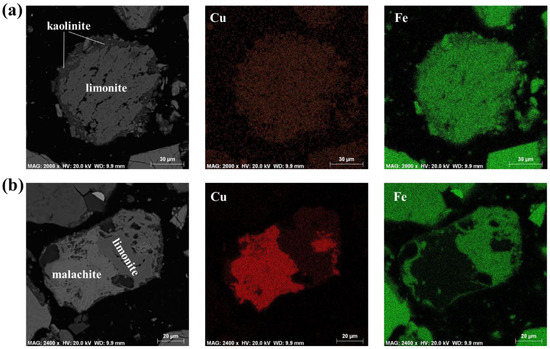 Surface scans of copper and iron elements in COBL ore from SEM-EDS: (a) limonite and kaolinite; (b) limonite and malachite.