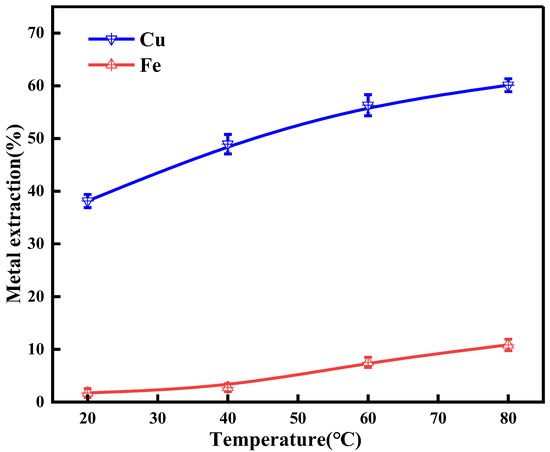 Higher temperatures enable faster kinetic reactions in chemical system [29]. In order to study the extraction of copper from the COBL ore at different temperatures, the COBL ore agitation leaching experiments were performed at 20 °C, 40 °C, 60 °C, and 80 °C. The concentration of sulfuric acid was 300 kg/t (3.06 mol/L), the liquid to solid ratio (vol/wt) was 3:1, and the leaching time was 4 h. According to the results in Figure 5, it can be seen that increasing the leaching temperature had a positive effect on both copper and iron leaching. When the temperature was 80 °C, the highest extractions of copper and iron were obtained, 60.11% and 10.85%, respectively. An appropriate increase in temperature can accelerate the COBL ore reactivity with sulfuric acid. For hydrometallurgical processes, the increase in temperature also accelerates the rate of chemical reaction and diffusion, resulting in an increase in the extraction of metals. However, due to the high altitude and average annual temperature of about 15 °C in Tibet, the increase in leaching temperature will also make the cost increase. Moreover, iron is the key element as it directly affects the acid consumption and also it creates major problems in selective recovery of metals from pregnant leach solution [20]. Therefore, the temperature of leaching was controlled within 40 °C.