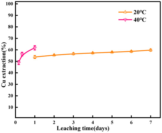In chemical systems, the increase in reaction time makes the kinetic reaction faster. A series of COBL ore leaching experiments was conducted with different time. During experiments, the sulfuric acid concentration was 300 kg/t, and the leaching temperature were 20 °C and 40 °C, respectively. The results were shown in Figure 6. It can be seen that after a certain leaching time, the leaching values of the COBL ore at 20 °C presented a linear trend with respect to time, rather than a sharp continuous increase. The extraction efficiency of copper was only about 60% when the leaching time was 7 days. On the contrary, the extraction efficiency of copper for leaching one day could reach 60% when the temperature was 40 °C. This indicated that direct leaching of COBL ore did not yield high recovery efficiency of copper, and it would consume a lot of cost and energy.