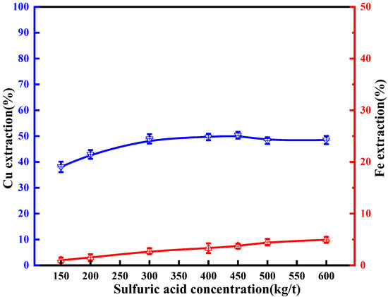 In Figure 7, it appeared that sulfuric acid concentration did not have a significant effect on extraction values of copper. On the contrary, the leaching efficiency of iron had been increasing with increasing acid concentration. Furthermore, since iron is more reactive than copper, iron consumes acid more easily. In order to reduce the dissolution of iron, the concentration of sulfuric acid should not be too high. As can be seen from Figure 7, the copper leaching efficiency basically reached the maximum at a sulfuric acid concentration of 300 kg/t, which was about 50%. Therefore, the optimum dosage of sulfuric acid in this experiment was 300 kg/t.