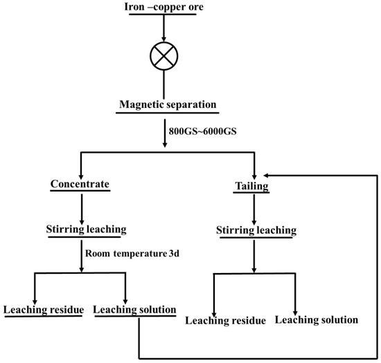 The COBL ore was first ground to −74 μm. The sample was filtered and dried after grinding. Then the sample was cooled to room temperature and weighed to 100 g. Fourthly, it was sieved with a 200-mesh sieve. Finally, the product under the sieve (−74 µm) was weighed, 73 g, accounting for 73%. Then it was sorted and separated with the help of a magnetic separation tube (XCGS50, WMME Co., Ltd., Jiangxi, China) under the magnetic field strengths of 0.08 T and 0.35 T to obtain the concentrate, and the tailing was sorted with the help of high gradient magnetic separator (DLSD, DLS Co., Ltd., Hunan, China) under the magnetic field strength of 0.6 T. Finally, the COBL ore was sorted into a high iron and low copper magnetic concentrate and a low iron and high copper magnetic tailing. The flowsheet is shown in Figure 2. Due to the obvious differences in their wet leaching properties, the separation method of the fractionated leaching process was adopted subsequently. Agitation leaching experiments were carried out in 500 mL glass flasks. Parameters such as temperature, time, acid concentration, and particle size were investigated to determine the optimum leaching conditions. The leaching temperature range is 20 to 80 °C, the sulfuric acid concentration is 150 to 600 kg/t, the leaching time is 4 h to 7 days, and the particle size range is −0.04 mm, accounting for 53% to 87%. For magnetic concentrates, it was treated by stirring leaching at room temperature. For magnetic tailing, it was leached by sulfuric acid agitation leaching method at 40 °C. During the leaching experiments, the weight of COBL ore was 100 g. The liquid-to-solid ratio (vol/wt) was 3:1. The leaching experiments were carried out in a mechanical stirring water bath (HJ-4S, SB Co., Ltd., Changzhou, China). The effects of temperature, sulfuric acid concentration, partical size, and leaching time on leaching copper from the COBL ore were investigated, respectively. The copper contents of leaching solution were analyzed by inductively coupled plasma—optical emission spectroscopy (ICP-OES). The leaching residue was tested by XRF.