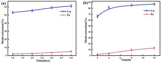 For magnetic concentrate, the leaching time was longer because the concentrate was more difficult to leach. As shown in Table 4 and Figure 12a, increasing leaching time had a promoting effect on the extraction of metals. When the leaching time exceeded two days, the extraction efficiency of copper did not change much, and the dissolution of iron would affect the experiment. Therefore, the optimal time for magnetic concentrate in the experiment was 3 days. For magnetic tailing, the leaching temperature was 40 °C. Table 4 showed that the leaching efficiency of copper was about 82% when the leaching time was 4 h. Moreover, it can be seen from Figure 12b that the leaching efficiency of copper increased with the increase in leaching time, but the increasing trend of iron leaching efficiency was more obvious. When the leaching time was 12 h, the leaching efficiency of iron reached 13%. Therefore, the leaching time should not be too long in order to control the extraction of iron. The optimum leaching time for magnetic tailing was selected as 4 h. The total copper recovery efficiency was shown in Table 4. The copper leaching efficiencies of concentrate and tailing cannot be directly added up, and the total copper recovery has to be calculated based on their respective copper recoveries. It indicated that the copper recovery could reach about 72% when the concentrate leaching time was 3 days. Therefore, the copper leaching efficiency can be increased by about 32% using this process.