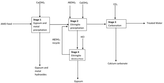 A total of 3 types of water, namely potable water, AMD treated with Ca(OH)2, and AMD treated with the Veolia process, were selected as the process medium in this study. Potable water was Randburg municipal water which constituted the baseline water. An amount of 2 L of potable water was collected into clean glass bottles from the tap and was immediately submitted for characterisation. Water analysis was completed within a day of collection. AMD is water that has been impacted by the mining industry and was obtained from a shaft of the Western Basin in Randfontein from the Witwatersrand mining area in South Africa. A total of 40 L of AMD was immediately refrigerated after collection, transported, and maintained at −20 °C until analysis and flotation tests. Refrigeration was necessary to preserve, as far as possible, the chemistry of the AMD. AMD treated with Ca(OH)2 was further treated using the Veolia process, as shown in the flowsheet depicted in Figure 1. The Veolia process is regarded at the simplest technology to reduce high SO42− concentrations. In Stage 1, the AMD treated with Ca(OH)2 is reacted with lime at pH 12.0–12.4 to precipitate the heavy metals as metal hydroxides. The solution is then filtered to remove the metal hydroxides while the gypsum (CaSO4) is crystallised out of the solution. The saturated gypsum water from Stage 1 is reacted with Al(OH)3 at pH 11.4–12.4 to further remove Ca2+ and SO42− from the solution as ettringite precipitate which is dissolved in HCl in stage 4 at pH 6.5–6.8 to regenerate the Al(OH)3. The overflow water from Stage 2 is then contacted with carbon dioxide to precipitate calcium carbonate at pH 7.8–8.6. The treated water was then used as one of the process and transport mediums for flotation tests.