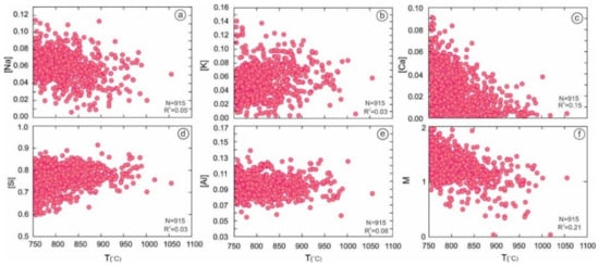 Indirect estimation of magma crystallization temperature by using the composition of the whole rock is a challenging subject in igneous petrology. This matter is an important subject for understanding the evolution of igneous rocks, and there are different thermometry methods based on the mineral equilibria and compositions in igneous and metamorphic rocks [1,2,3,4,5,6,7,8,9,10,11]. Here, we briefly mention some common thermometry methods in igneous rocks, including Zr content in rutile in equilibrium with quartz and zircon (T(°C) = 127.8 × ln (Zr in ppm) − 10) [12]), Ti incorporation in zircon (TZircTi (°C) = [1]), and Ti in quartz (T(°C) = [2]. Apatite saturation thermometry is particularly applicable for peraluminous rocks [4]. The Fe-Ti oxide composition in the intrusive rocks is valuable for the determination of the temperature and oxygen fugacity [5]. Two feldspars thermometry has a long history and was developed by several researchers [6,7,8]. The composition of plagioclase is sensitive to the temperature in the magmatic melts. Accordingly, plagioclase compositions are a respectable thermometer in igneous rocks [13,14,15,16]. Likewise, Ghiorso and Evans [17] developed a new approach of thermometry in the oxide solid solution of Fe2O3-FeTiO3-MgTiO3-MnTiO3 with less Al2O3.