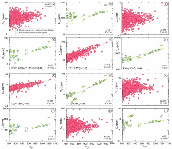 Accessory minerals, such as zircon and ilmenite, can control the concentrations of Zr and Hf during partial melting and magma differentiation [47]. Additionally, Zr and Hf are immobile [48]. The plotting of the Zr-Hf versus the calculated temperature shows a positive correlation between Zr and Hf contained in the whole-rock composition and temperature (Figure 4e–h). In the peraluminous and metaluminous datasets, there was a positive linear regression (R2 = 0.71) between temperature and Zr at the >99% confidence level (p < 0.01) (Figure 4e) (Equation (8)). The correlation diagrams and equations appear as follows: