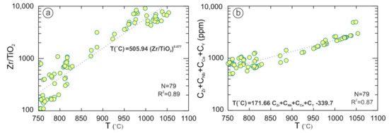 HFSE- based parameters (a) Zr/TiO2 and (b) CZr + CNb + CCe + CY versus T (°C) with a strong correlation with temperature in peralkaline and alkaline rocks (n = 79 peralkaline to alkaline rocks with M > 2, and SiO2 > 45wt.%, http://georoc.mpch-mainz.gwdg.de/georoc/, accessed on 29 August 2021.