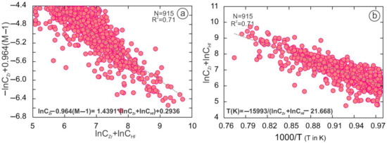 (a) lnCZr + lnCHf to lnCZr + 0.964(M–1) and 1000/T (T in K) show a negative correlation (b) Accordingly, CZr + CHf in bulk composition could be related to the temperature. (n = 915, and M < 2 http://georoc.mpch-mainz.gwdg.de/georoc/, accessed on 29 August 2021).