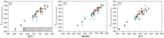 In our dataset, we considered that the TZr was not equal to the TMagma and that it showed the temperature of zircon crystallization. Here, the estimation of magma crystallization temperature for all datasets was calculated by using Equations (5) and (6), presented in Tables S1 and S2.