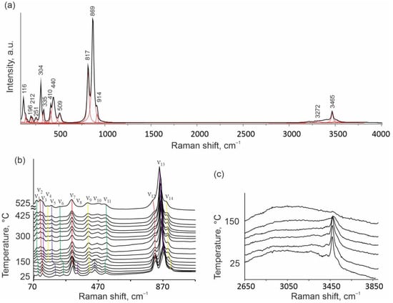 Raman spectra of BaAs2Zn2O8∙H2O under ambient conditions from 70 to 4000 cm−1 (a); at different temperatures from 70 to 1070 cm−1 (b) and from 2650 to 3850 cm−1 (c).