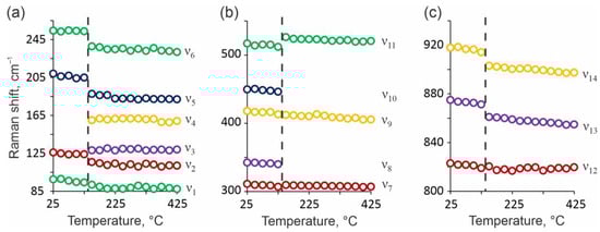 Temperature evolution of some selected Raman bands from 85 to 265 cm−1 (a), from 300 to 550 cm−1 (b), and from 800 to 940 cm−1 (c). The broken vertical lines demonstrate the abrupt changes in the temperature evolution of the Raman bands. The errors are smaller than the size of the symbols.