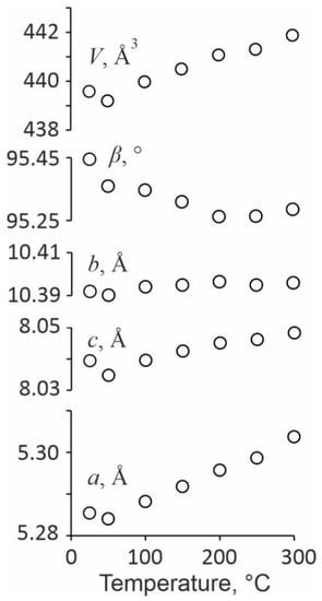 The temperature dependencies of the unit-cell parameters were described by quadratic and linear (for comparison with other minerals) polynomial functions in the whole temperature range (see below for more details). Based on these data, the thermal expansion coefficients were determined using the TTT program package []. This program package has also been used for the thermal-expansion parameter tensor visualization.