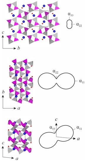 - Bubnova, R.S.; Firsova, V.A.; Filatov, S.K. Software for determining the thermal expansion tensor and the graphic representation of its characteristic surface (Theta to Tensor-TTT). Glass Phys. Chem. 2013, 39, 347–350. [Google Scholar] [CrossRef]