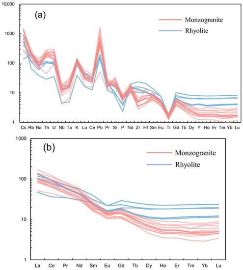Primitive-mantle-normalized trace element (a) and chondrite-normalized REE (b) variation diagrams for samples from the Demingding deposit [42].