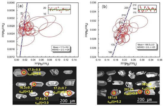 Zircon grains separated from Demingding monzogranites and rhyolites are generally prismatic, colorless, transparent, and euhedral. Cathodoluminescence (CL) images clearly show microscale oscillatory zoning, suggesting magmatic origin (Figure 6). The zircon data show concordant U-Pb data with weighted mean 206Pb/238U age of monzogranite porphyry that yielded an age of 17.3 ± 0.6 Ma (MSWD = 2.5, Figure 6a), suggesting that the Demingding monzogranite porphyry was formed in Miocene. The zircon grains from the rhyolite porphyry yielded a U-Pb age of 186.5 ± 3 Ma (MSWD = 2.0, Figure 6b), indicating the emplacing age of early Jurassic. Results of zircon U-Pb isotopic data are listed in Table 2.
