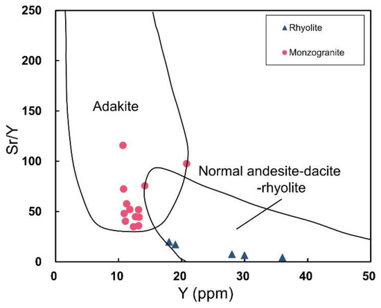 Sr/Y classification diagram for the Demingding monzogranite and rhyolite, after [45].