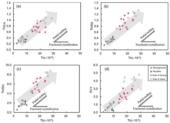 Correlation diagrams of Th/La (a), Th/Nd (b), Th/Sm (c), Th/Y (d) vs. Th for the Demingding monzogranites and rhyolites. Data sources: Qulong from [61]; Jiama from [62].