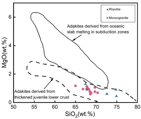 The plots of MgO versus SiO2 field for the Demingding monzogranite and rhyolite, after [63].