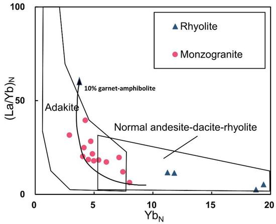 (La/Yb)N versus YbN classification diagram for the Demingding monzogranite and rhyolite, after [45].