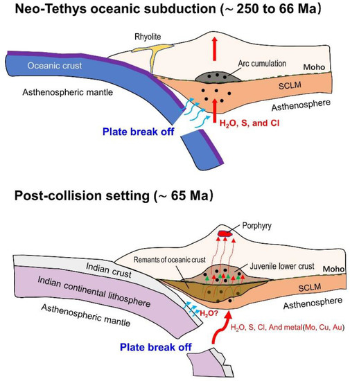 The post-subduction magmas could share many of the geochemical and isotopic characteristics of the preceding arc magmatism [16,73,74]. The present zircon U-Pb ages of the Demingding monzogranites are dated at 17.3 ± 0.6 Ma (Figure 6a) and the rhyolites are dated at 186.5 ± 3 Ma (Figure 6b). These two age values should indicate two tectonic-magmatic events from oceanic subduction to continental collision. The ages of monzogranites are also consistent with those of most Miocene large to giant porphyry deposits in Gangdese under a similar tectonic setting [17,51,75], while the older ages of rhyolites show affinity with the oceanic subduction [76,77]. Significantly, recent studies suggested that the Neo-Tethyan subduction might have had an important influence on the large-scale magmatism and mineralization during this period [78].