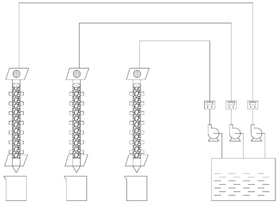 For the leaching test, cyanide tailings were used to simulate rainwater leaching at a flow rate of 2.5–10 mL/(min·kg) for 11 days. The initial leaching solution pH value was manually configured at 6–7. The simulated dynamic leaching experimental device is shown in Figure 1. The leaching column was plexiglass with a height of 50 cm and a radius of 4 cm. The bottom was sealed with a plexiglass plate with a 2 mm diameter circular hole. In order to prevent sample loss and ensure uniform distribution of the leaching solution, an inert quartz sand, nonwoven fabric and qualitative filter paper were laid on the bottom and upper layers of the leaching column, respectively. The fresh cyanide tailings were divided into 1 kg aliquots and used to fill the leaching column. The isolation temperature (room temperature 20–22 °C), wind force, and light of the leaching solution were maintained. Under different leaching intensity (0.5 mm/min, 1.5 mm/min, and 2.0 mm/min) and temperature (2 °C, 12 °C, and 22 °C), the effect of leaching on the degradation of cyanide tailings was investigated. Samples were taken at certain intervals to determine the content of cyanide in the leaching solution. Three sets of the same leaching device were used to carry out the experiment.