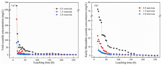Figure 2a,b show the change in total cyanide and easily liberatable cyanide concentration with leaching time under leaching intensities of 0.5 mm/min, 1.5 mm/min, and 2.0 mm/min. The cyanide in the leaching solution decreased with the increase in leaching intensity. Under the same condition, the concentration of total cyanide and easily liberatable cyanide decreased with time, and, in the initial stage, the concentration of cyanide decreased sharply. After leaching for 15 h, the concentrations with a leaching intensity of 2 mm/min were 82.8 mg/L and 16.4 mg/L for total cyanide and easily liberatable cyanide, respectively. At this time, at a leaching intensity of 1.5 mm/min and 0.5 mm/min, the total cyanide concentrations were 243 mg/L and 678 mg/L, respectively, and the easily liberatable cyanide concentrations were 22.3 mg/L and 72.2 mg/L, respectively. This may be because, compared with the low and medium leaching intensity, the higher leaching intensity caused a greater leaching shear force on the leaching residue [19]. The stronger scouring force on the microstructure of cyanide tailings led to their serious erosion. Water and air enter into the cyanide tailings and react as shown in Equations (1) and (2) [20,21]. Therefore, the increase in leaching intensity led to a decrease in cyanide concentration in the leaching solution. To the end, the concentration of cyanide leaching solution tended to gradually stabilize, effectively reaching 0 after 104 h of leaching. It is worth noting that, at 0.5 mm/min intensity, this result took 176 h. It can be seen that the leaching intensity and leaching time had an effect on the concentration of cyanide.