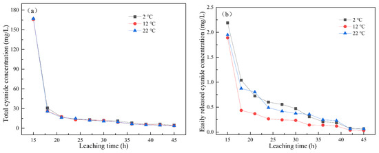 When the leaching intensity was 2 mm/min, the changes in total cyanide concentration and easily liberatable cyanide concentration with leaching time under leaching temperatures of 2 °C, 12 °C, and 22 °C are shown in Figure 3a,b. With the increase in leaching temperature, the content of cyanide in the leaching solution decreased. At the same leaching temperature, the concentrations of total cyanide and easily liberatable cyanide decreased with the increase in leaching time. The total cyanide concentration gradually stabilized after 36 h of leaching, reaching less than 10 mg/L, and the easily liberatable cyanide concentration gradually tended to 0 after leaching for 42 h. The dissolution of cyanide is an exothermic reaction. According to Equations (1) and (2), in the temperature range of 0–35 °C, the changes in reaction enthalpy and entropy were < 0, indicating that the reaction would be spontaneous at low temperature [22]. Therefore, the leaching temperature had little effect on the concentration of cyanide in the leaching solution.
