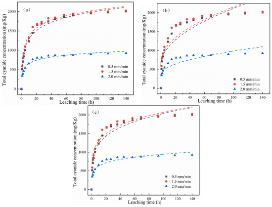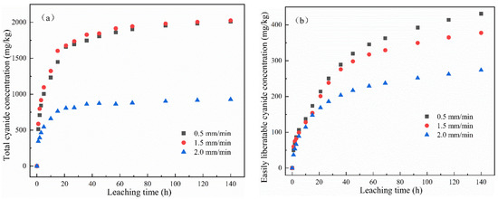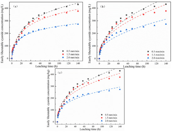 The change in the cumulative release of total cyanide and easily liberatable cyanide with time is shown in Figure 4. It was found that the cumulative release of total cyanide was little affected by a low leaching intensity, while the cumulative release of easily liberatable cyanide decreased with the increase in leaching intensity. It can be seen from Figure 4a,b that, in the whole cyanide leaching process, with the extension of the leaching time, the leaching cumulative release of total cyanide and easily liberatable cyanide showed two stages: initial high-speed accumulation followed by a slow and continuous growth trend. Moreover, different leaching intensities had different effects on the cumulative release of cyanide. The main reason may be that the cyanide on the surface of the cyanide tailings entered into the leaching solution at a fast speed. The second stage was a relatively slow release process due to the content of cyanide in the tailings gradually decreasing and slowly diffusing into the solution.