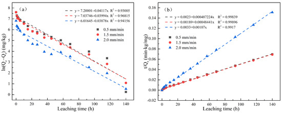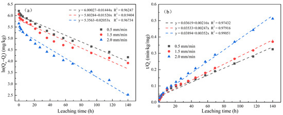 The leaching models used by researchers mainly include first-order, second-order, double constant, parabolic diffusion, and Elovich kinetic equations [22,23,24]. The kinetic equation is obtained from the rate equation according to different reaction mechanisms. Therefore, by fitting the experimental data with different equations, the leaching mechanism of the actual process can be determined [25].