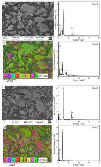 SEM-EDS analysis of cyanide tailings (a1,a2) before dynamic leaching, and (b1,b2) after dynamic leaching.