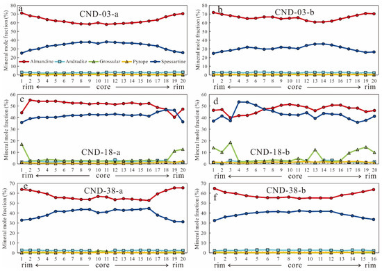 The core–rim chemical profiles of garnets: (a,b) garnets from the muscovite granite; (c–f) garnet grains from the pegmatite.