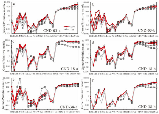 Primitive mantle-normalized trace element spider diagrams of garnets. (a,b) garnets from the muscovite granite; (c–f) garnet grains from the pegmatite (primitive mantle normalization data from [63]).