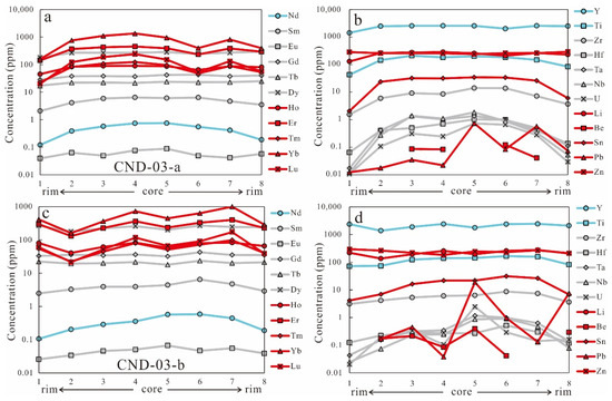 Overall, the garnets from the muscovite granite and pegmatite exhibit zoning with rim-ward spessartine depletion and almandine enrichment trends, except for sample CND–18, which shows a complex and/or irregular variation pattern (Figure 4). However, it is important to note that sample CND–18 shows grossular enrichment sharply towards the rim (Figure 4c,d). Element mapping suggests that the grain CND–03–a has higher Mn and lower Fe contents in the extremely narrow rim compared to the mantle (Figure 9). In addition, garnets from the pegmatite show enrichment of HREE and Y in the core (Figure 5c–f, Figure 7, and Figure 8c–f). In contrast, the HREE and Y zonings in garnets from the muscovite granite are inconspicuous (Figure 6 and Figure 8a,b). The zonation in all the analyzed garnets is less prominent for MREE, Li, and Zn (Figure 6 and Figure 7). Diagrams show that the rim-ward depletion trends of Zr, Hf, Nb, Ta, and U are similar to those of Nd and Sn (Figure 5, Figure 6 and Figure 7).