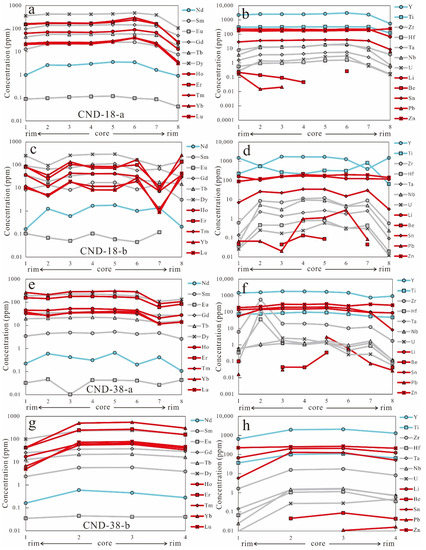(a–h) Rare earth element and trace element core–rim profiles of garnet from the pegmatite.