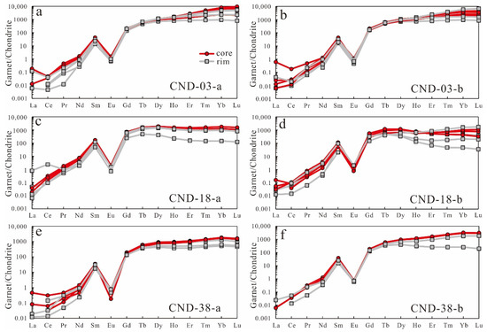 Chondrite-normalized REE patterns of garnets: (a,b) garnets from the muscovite granite; (c–f) garnets from the pegmatite (chondrite normalization data from [63]).