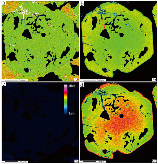 Element maps of Al (a), Fe (b), Ca (c), and Mn (d) for the garnet CND–03–a from the muscovite granite.