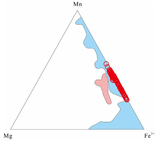Mn–Mg–Fe ternary diagram. The pink area represents the magmatic garnet field from S-type granite [21], and the light blue area represents the magmatic garnet field from [87]. Garnets from the muscovite granite and pegmatite fall in the field of magmatic garnet reported by [87].