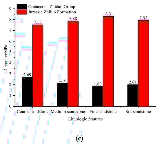 | Cohesion/(Pa) | 8.89 × 106 | 6.99 × 106 | 7.39 × 106 | 5.23 × 106 | 2.28 × 106 | 6.50 × 105 |