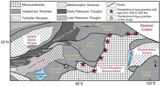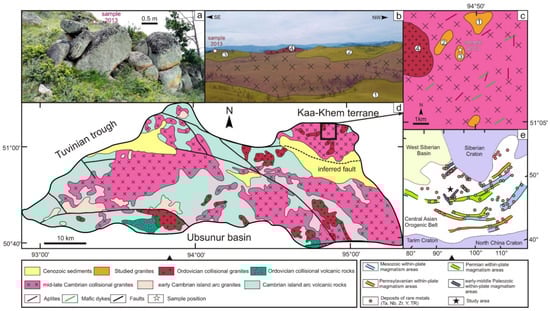 - Vetrov, E.; Chernykh, A.; Babin, G. Early Paleozoic Granitoid Magmatism in the East Tannu-Ola Sector of the Tuvinian Magmatic Belt: Geodynamic Setting, Age, and Metallogeny. Russ. Geol. Geophys. 2019, 60, 492–513. [Google Scholar] [CrossRef]