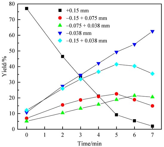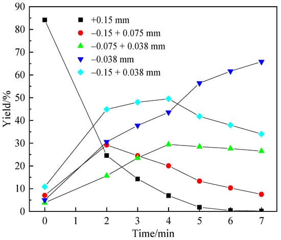 It can be seen from Table 8 and Figure 5 that with the increase of grinding time, the yield of +0.15 mm particle size has been reduced, and the reduction speed gradually slows down. The yield of −0.15 + 0.075 mm and −0.075 + 0.038 mm particle size increases firstly and then decreases. The yield of −0.15 + 0.075 mm particle size reaches the maximum at 2 min, that of −0.075 + 0.038 mm particle size reaches the maximum at 4 min, and that of −0.15 + 0.038 mm particle size reaches the maximum at 4 min. The yield of −0.038 mm particle size increases all the time, and changes greatly before and after 4 min, which basically shows a linear law. Because 4 min is the most efficient grinding technology, 4 min is selected as the appropriate grinding time.