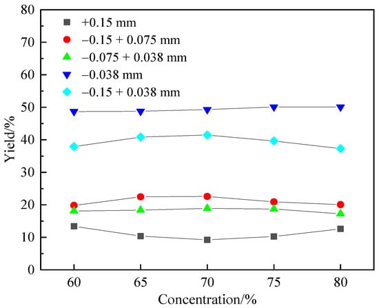 It can be seen from Table 9 and Figure 6 that with the increase of grinding concentration, the yield of +0.15 mm particle size decreases firstly and then increases, reaching the minimum value at concentration 75%. The yield of −0.15 + 0.075 mm particle size shows a trend of decreasing firstly, then increasing and then decreasing, and reaching the minimum at grinding concentration 70%. The yield of −0.075 + 0.038 mm particle size increases firstly and then decreases, reaching the maximum at grinding concentration 70%. The yield of −0.038 mm particle size, as the most fine particle, increases all the time. When the grinding concentration increases to a certain extent, the change of yield is small. The grinding technical efficiency reaches the maximum when the grinding concentration is 75%. Therefore, 75% is selected as the appropriate grinding concentration.