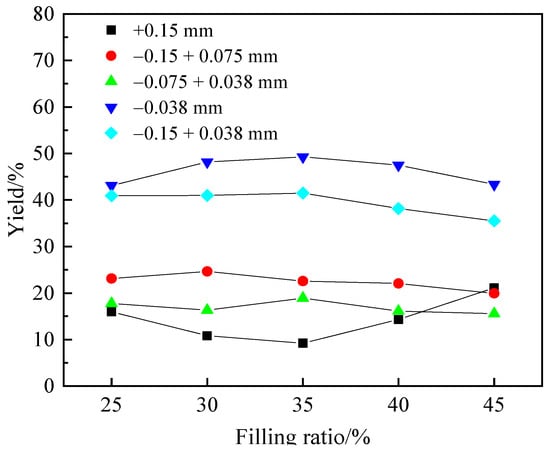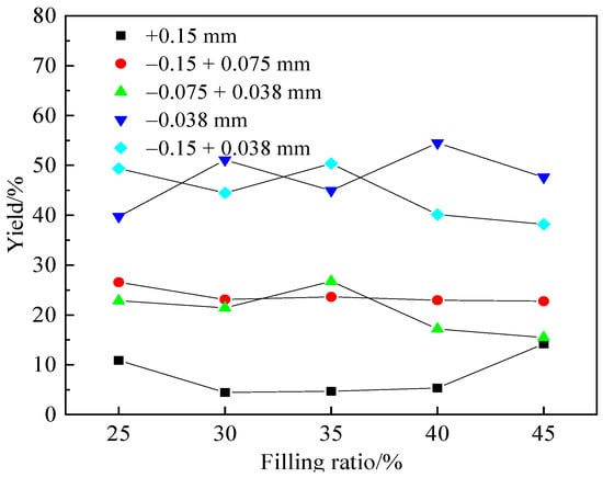 It can be seen from Table 10 and Figure 7 that, with the increase of filling ratio, the yield of −0.15 + 0.075 mm and −0.075 + 0.038 mm particle size decreases firstly, then increases and then decreases. If the filling ratio is too high or too low, the yield of +0.15 mm particle size will increase. When filling ratio is 30%, the yield of +0.15 mm particle size will reach the minimum. The variation trend of yield of −0.038 mm particle size is basically opposite to that of −0.15 + 0.038 mm particle size, and the variation law with filling ratio is more complex. The grinding technical efficiency reaches the maximum when the filling ratio is 35%. Therefore, 35% is selected as the appropriate filling ratio.
