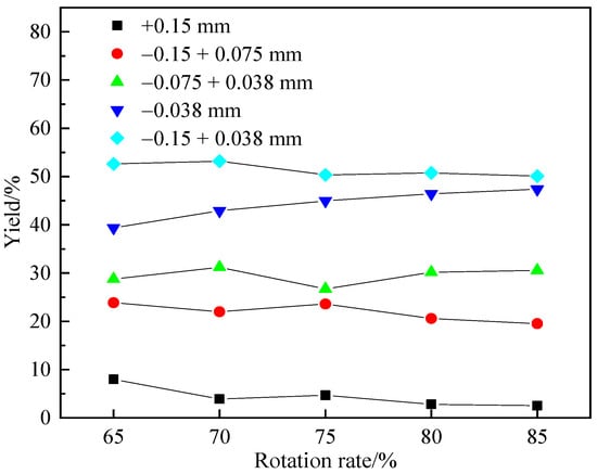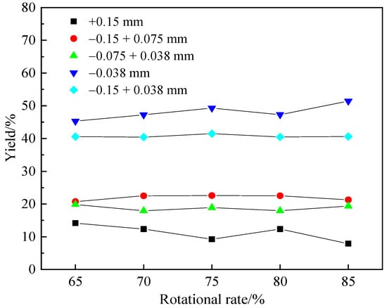 It can be seen from Table 7 and Figure 4 that with the increase of rotational rate, +0.15 mm particle size decreases firstly, then increases and then decreases, reaching the minimum value when the rotational rate is 85%. The yield of intermediate particle size of −0.15 + 0.038 mm has little change and reaches the maximum when the rotational rate is 75%. The variation law of yield of −0.038 mm particle size is opposite to that of +0.15 mm particle size. It is the trend of increasing firstly, then decreasing and then increasing, and reaching the maximum at rotational rate 85%. The change of rotational rate has little effect on the yield of qualified grinding particles. For the yield of undergrinding and overgrinding particles, there is a law of change between one and the other. The maximum difference of grinding technical efficiency is 1.88%. Therefore, 75% is selected as the appropriate rotational rate.
