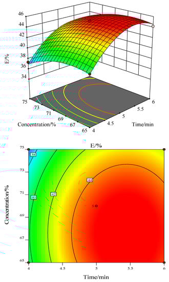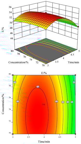As can be seen from Figure 9, with the increase of grinding time and grinding concentration, the surface value of grinding technical efficiency increases firstly and then decreases, reaching the maximum value at grinding time 5 min and grinding concentration 70%. From the perspective of single factor effect, the effect of grinding time on grinding technical efficiency is more significant than grinding concentration. From the contour map, the interaction between grinding time and grinding concentration is not significant.