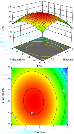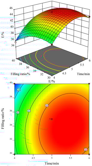 It can be seen from Figure 10 that, with the increase of grinding time and filling ratio, the curved value of grinding technical efficiency also increases firstly and then decreases, reaching the maximum value at grinding time 5 min and filling ratio 35%. From the perspective of single factor, compared with filling ratio, grinding time has a more significant influence on grinding technical efficiency. It can be seen from the contour map that the interaction between grinding time and filling ratio is significant.