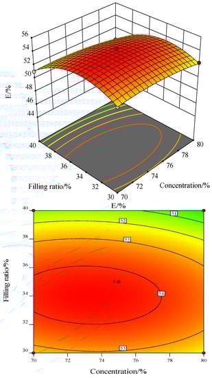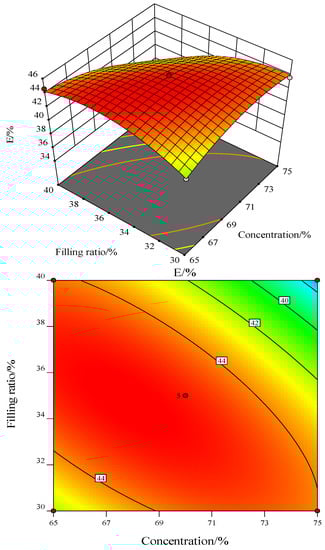 The response surface diagram and contour map of the interaction of grinding time, grinding concentration and filling ratio are shown in Figure 12, Figure 13 and Figure 14.