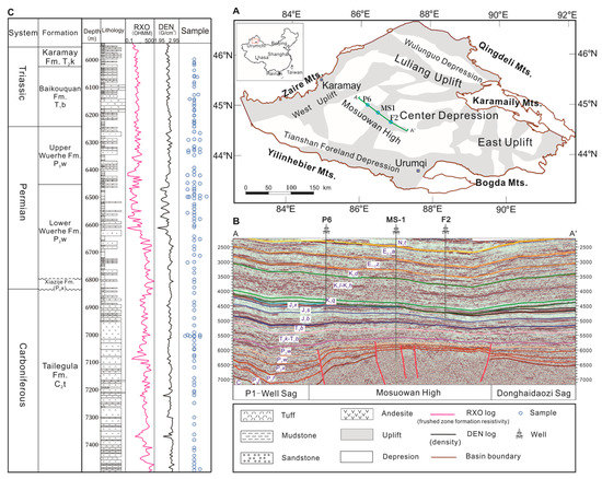 The MS-1 well is located in the Mosuowan Uplift in the Junggar Basin Central Depression, which is a typical basement uplift. The two flanks in the middle of and to the east of the Mosuowan Uplift have developed northwest-trending, geodesic, spreading reverse faults (Figure 1), which have opposite tendencies and make the Mosuowan Uplift have the morphology of a back-breaking block [31]. The stratigraphy drilled in the Carboniferous–Triassic MS-1 well is the Baikouquan Formation (T1b), Permian Upper Urho Formation (P3w), Lower Urho Formation (P2w), Xiazijie Formation (P2x), and Carboniferous Tamugang (C2t) [32]. In the Pre-Carboniferous–Carboniferous period, the central and western part of the Junggar Basin showed an island arc uplift area with calc-alkaline volcanic eruptions. At the beginning of the Permian, it was an island arc uplift zone with a northwest–west trend. With the intensification of denudation and sea level change, the island arc uplift was finally covered during the deposition of the Lower Permian Fengcheng Formation (P1f). At the end of deposition of the P2x, fold uplift occurred under the influence of north–south extrusion, and the P2x was locally erased, and the magnitude of the Mosuowan Uplift increased. The P2w–P3w were buried again during the depositional period. The Triassic was the period of stable deposition of the Mosuowan High [33,34,35].