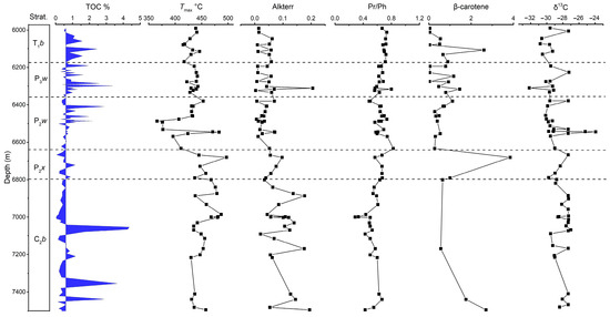 The following are available online at https://www.mdpi.com/article/10.3390/min12101299/s1, Table S1: TOC and rock pyrolysis parameters of the Late Carboniferous-Early Triassic rocks in MS-1 well, Table S2: Parameters of δ13C values of n-alkanes, Pr, Ph, β-carotene and chloroform extracts from MS1 wells of the Late Carboniferous-Early, Table S3: Parameters of hopance and sterane in Late Carboniferous-Early Triassic of MS1 well.