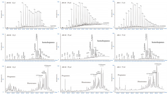 Terpenes (including hopanes) are biomarker compounds, including tricyclic terpenes and pentacyclic triterpenes. The tricyclic terpenes of these samples in terms of tricyclic terpene abundance were distributed C19 < C20 < C21 < C23 in an “ascending” pattern, and the tetracyclic C24 terpene abundance was higher. The C3117β,21α(H)-hopane αβ-22S/(S + R) values for the C2t, P2x, P2w, P3w, and T1b ranged from 0.38 to 0.67, 0.58 to 0.64, 0.51 to 0.64, 0.53 to 0.6, and 0.57 to 0.65 (Table 2). The values of C29/C30-hopane in the Carboniferous, Permian, and Triassic samples were 0.34–0.72, 0.43–0.89, and 0.42–0.82, respectively. Gammacerane is C30 pentacyclic triterpenoid, and high levels of gammacerane represent strongly reducing hypersaline environments [47,48,49], which were detected in all samples from the MS-1 well (Figure 3). The gammacerane indices (gammacerane/C31-hopane) of the C2t, P2x, P2w, P3w, and T1b ranged from 0.28 to 2.47, 0.51 to 0.73, 0.42 to 1.3, 0.21 to 0.67, and 0.21 to 0.83, respectively. The ratios of C27-17α(H)-tridecane (Tm) to C27-18α(H)-tridecane (Ts) effectively reflect the depositional environment and organic matter maturity [50,51,52,53]. Ts/Tm values in the Carboniferous, Permian, and Triassic samples ranged from 0.27 to 1.18, 0.28 to 0.91, and 0.22 to 0.79 (Table 2 and Table S2, Figure 3 and Figure 5). Steroids are another group of biomarker compounds, which are tetracyclic compounds with alkyl side chains, and the tetracyclic structures are collectively called steroid nuclei. The MS-1 well samples were rich in steroids, including C27–C29 regular steroids and rearranged steroid series, mainly regular steroids (Figure 4). The C29αααα-20S/20(S + R) values in the samples of C2t, P2x, P2w, P3w, and T1b ranged from 0.19 to 0.49, 0.42 to 0.49, 0.42 to 0.52, 0.42 to 0.49, and 0.43 to 0.5, respectively, while the C29-αββ/(αββ + αααα) values ranged from 0.23 to 0.51, 0.47 to 0.51, 0.44 to 0.53, 0.47 to 0.53, 0.47 to 0.53, and 0.47 to 0.57, respectively (Table 2 and Table S2, Figure 3, Figure 5, and Figure 6).